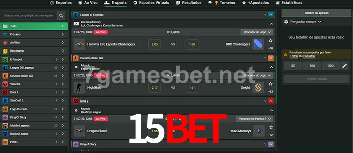 O 15Bet oferece uma grande seleção de opções de apostas em e-sports com probabilidades competitivas